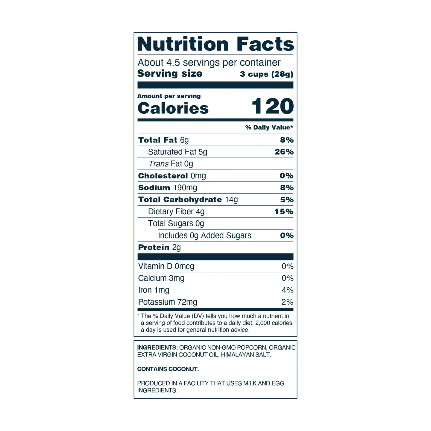Shouldn't a handful of popcorn only have a handful of ingredients? Ours has three: organic popcorn, extra-virgin coconut oil, and Himalayan pink salt. We make it with minimal processing for maximum snackability.